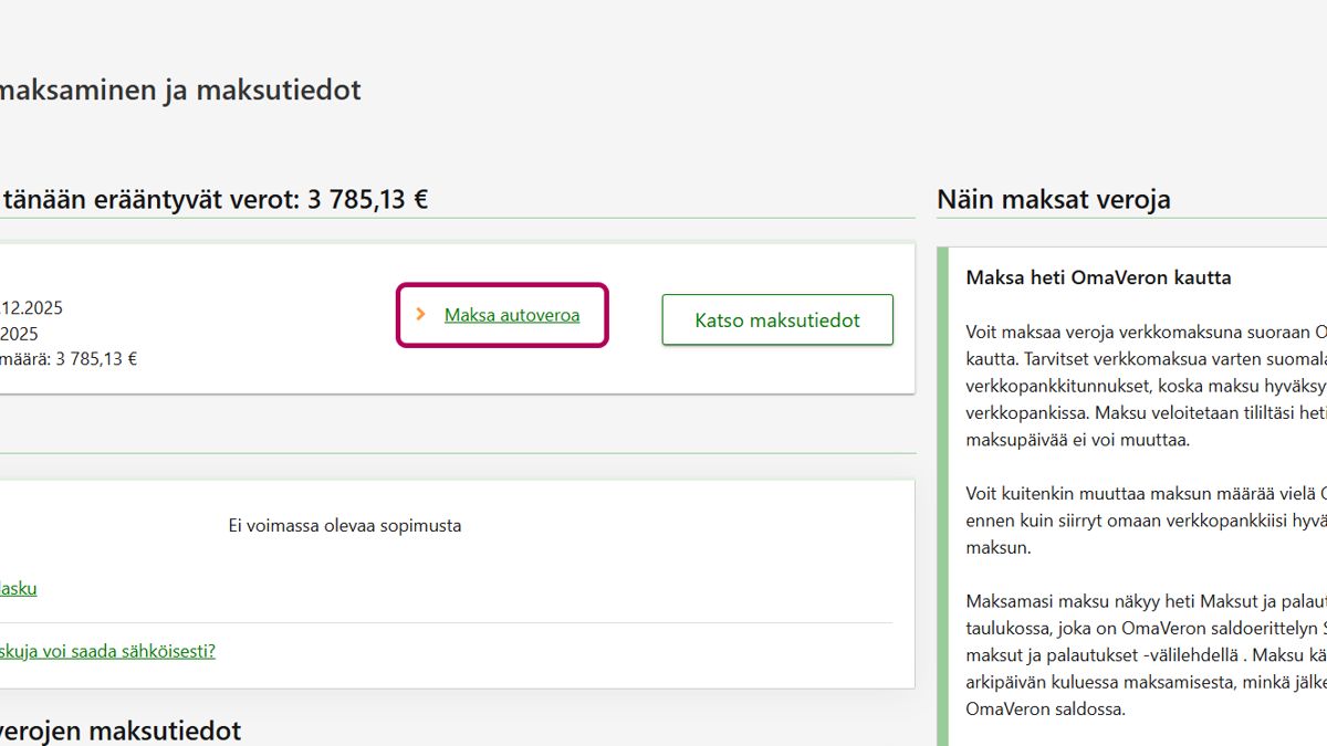 Maksettava autovero, joka ei ole vielä erääntynyt, näkyy sivun alussa kohdassa Tulevat ja tänään erääntyvät verot. Voit siirtyä maksamaan suoraan veron kohdalla olevan linkin kautta.