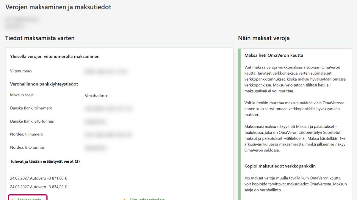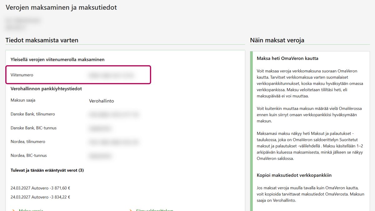 Jos maksat veron verkkopankissa, tarvitset maksua varten viitenumeron ja Verohallinnon tilinumeron.