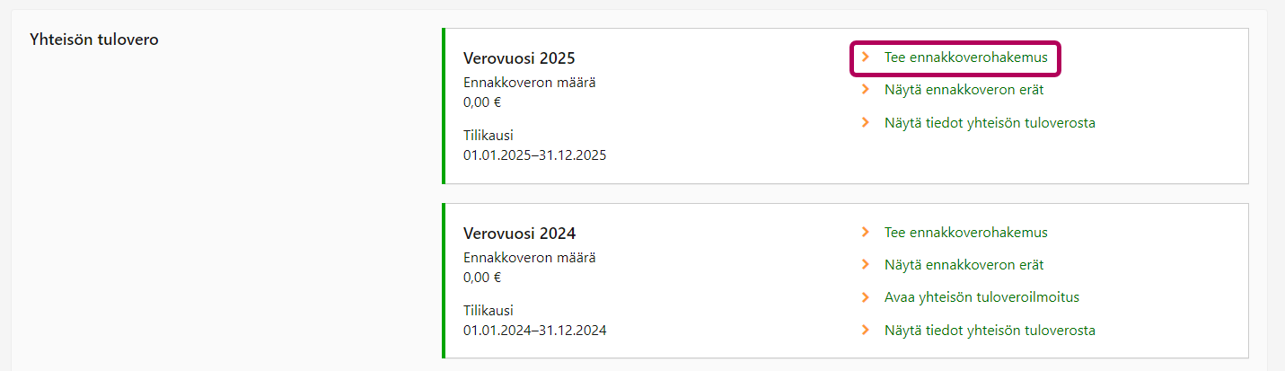 Valitse osiosta Yhteisön tulovero oikean verovuoden kohdalta linkki Tee ennakkoverohakemus.