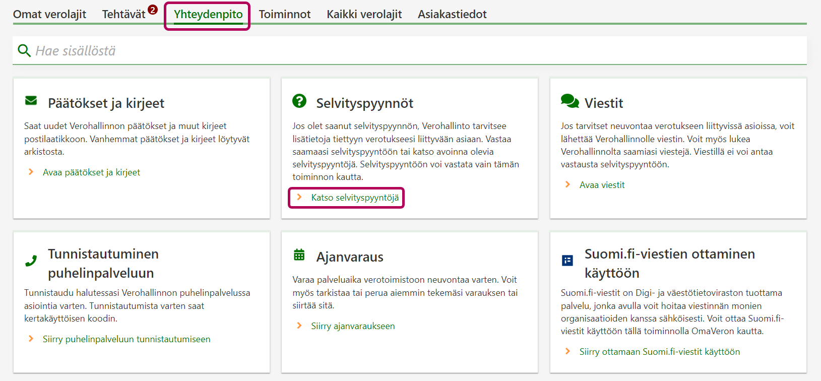 Jos sinulle on saapunut selvityspyyntö, löydät sen välilehdeltä Yhteydenpito. Samalta välilehdeltä löydät myös muut saapuneet päätökset ja kirjeet. Valitse linkki Katso selvityspyyntöjä kohdasta Selvityspyynnöt.