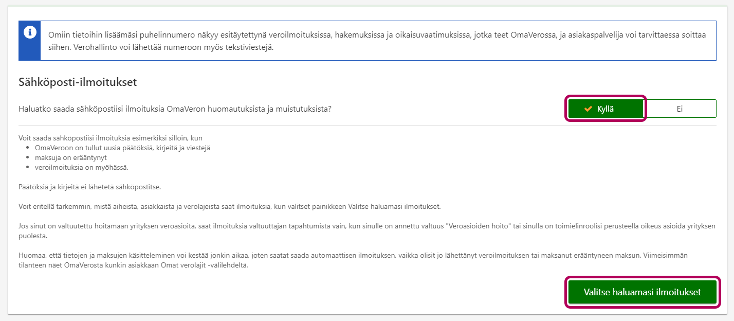 Jos haluat saada sähköpostiisi ilmoituksia OmaVeron huomautuksista ja muistutuksista, varmista, että valita on Kyllä.