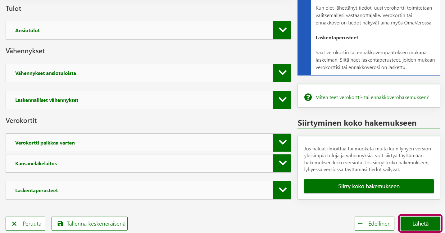 Jos huomaat, että sinun pitää ilmoittaa verokorttia varten myös muita tuloja tai vähennyksiä, voit siirtyä lyhyestä hakemuksesta koko hakemukseen milloin tahansa.