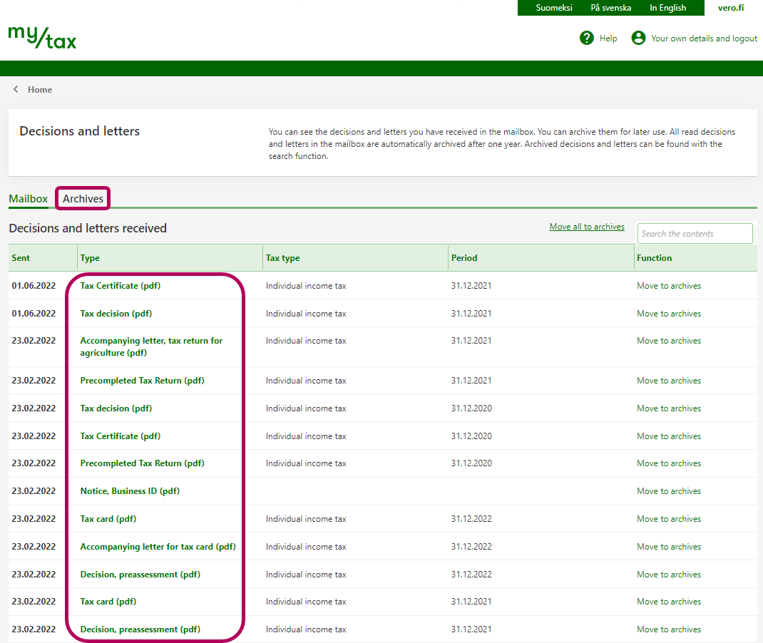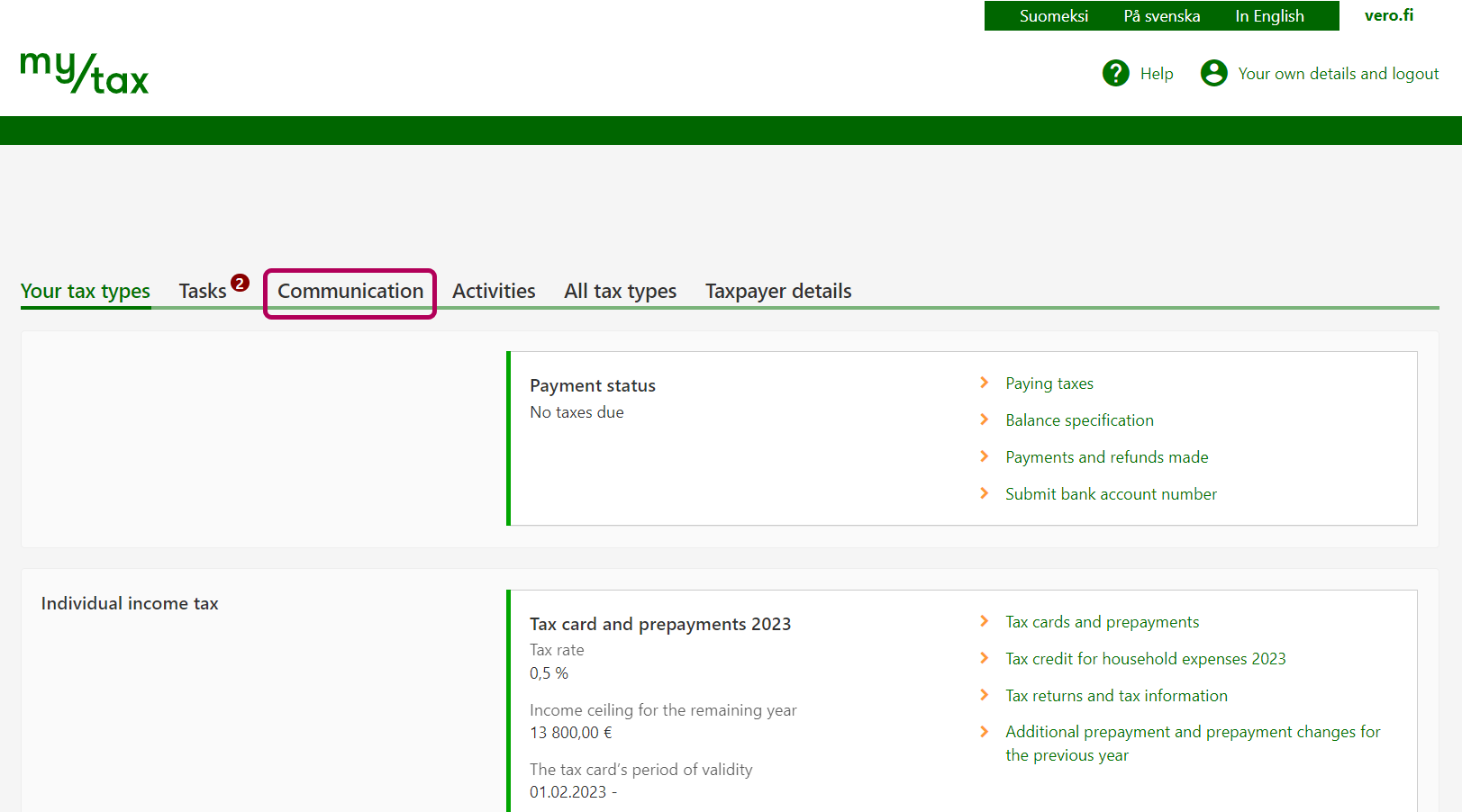The place where you will always find your tax mail is MyTax. This means that you can always open PDF versions of your tax cards, assessment decisions, various letters from the Tax Administration in MyTax. After you receive a new decision or letter in MyTax, a small red dot will appear on the Tasks tab.