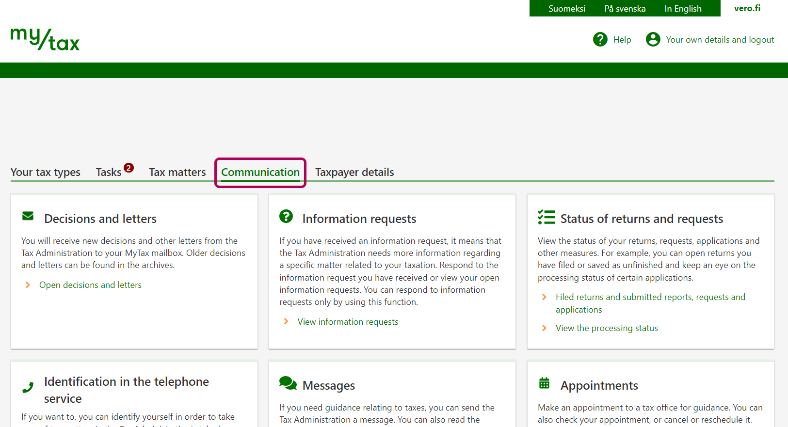 You can check that the returns, requests and applications you have submitted in MyTax have been received. On the same page, you can also find the returns, requests and applications that you have saved as unfinished.
