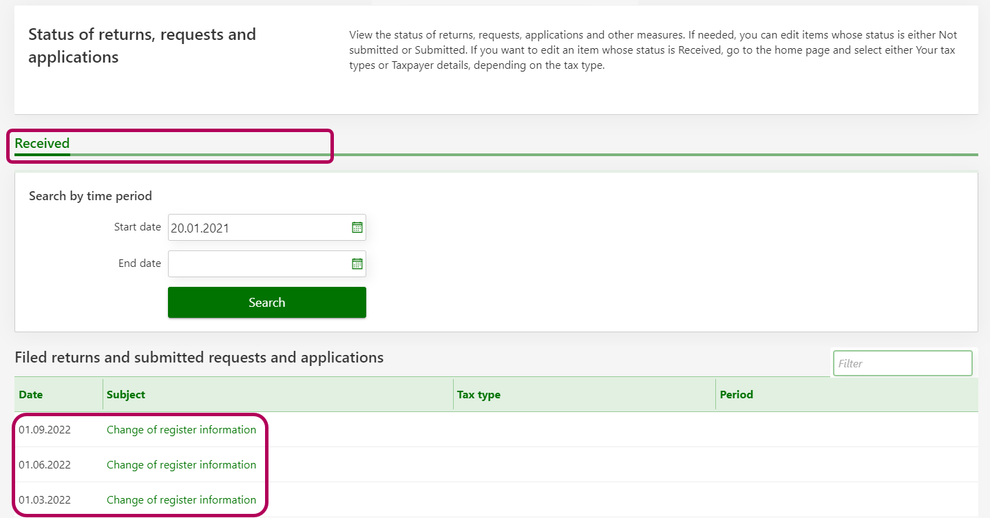 On the Received tab, you can find all the returns, requests and applications you have submitted over the last 12 months. In order to find returns, requests and applications that are over 12 months old, you need to use the search function.