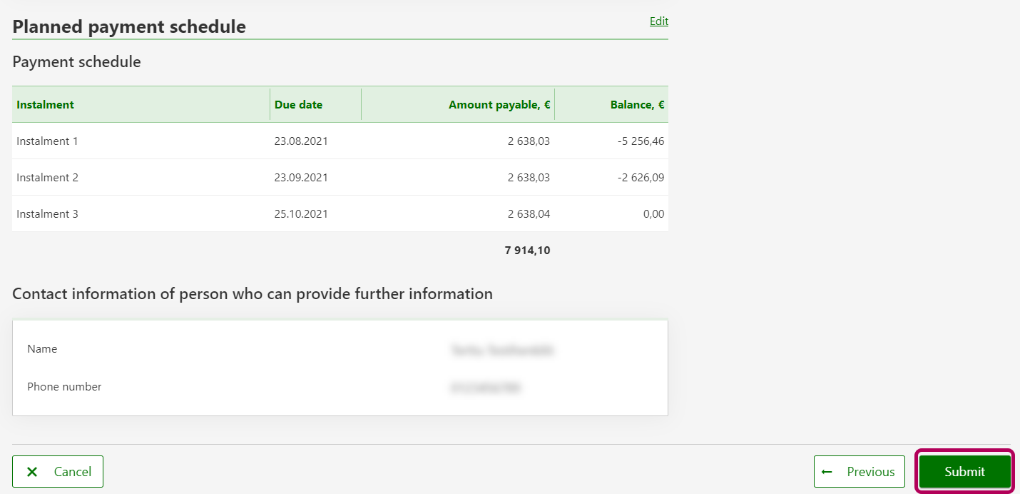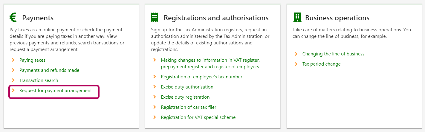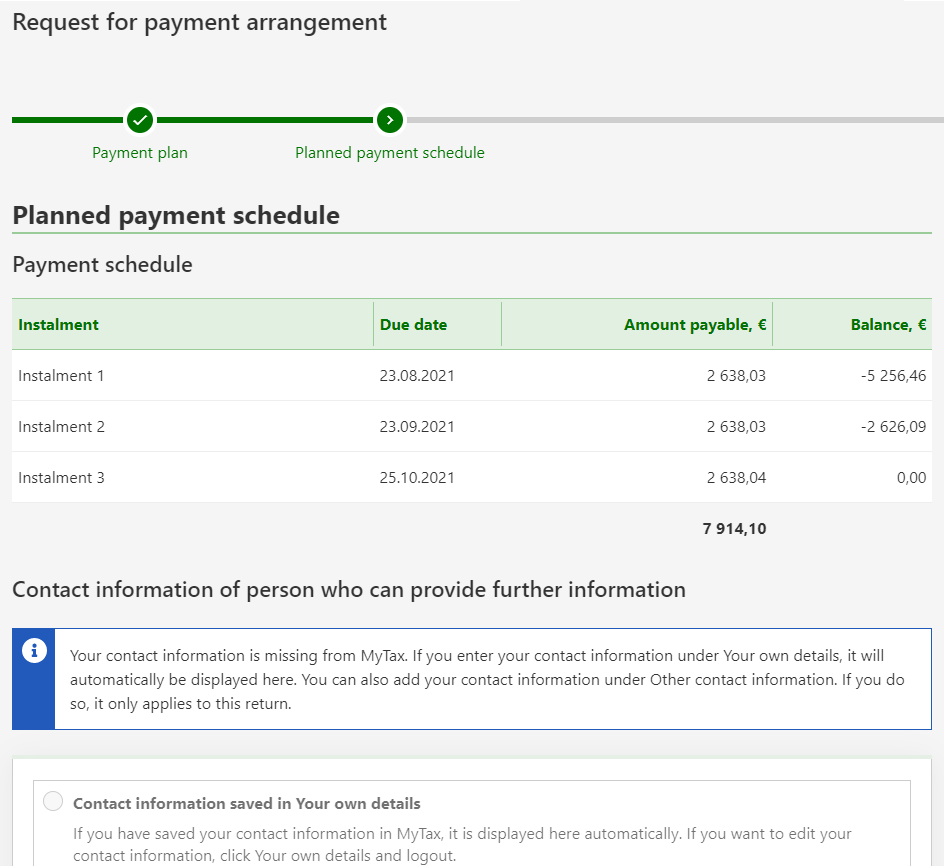 There can be 1–24 instalments. The interval between instalments is always 1 month. If you have only back taxes, prepayments, inheritance tax, gift tax and real estate tax to pay, you can choose the interval between the instalments to be 2 months. In that case, the maximum number of instalments is 12. The first due date must be within 30 days from the date when you submitted the request for payment arrangement.