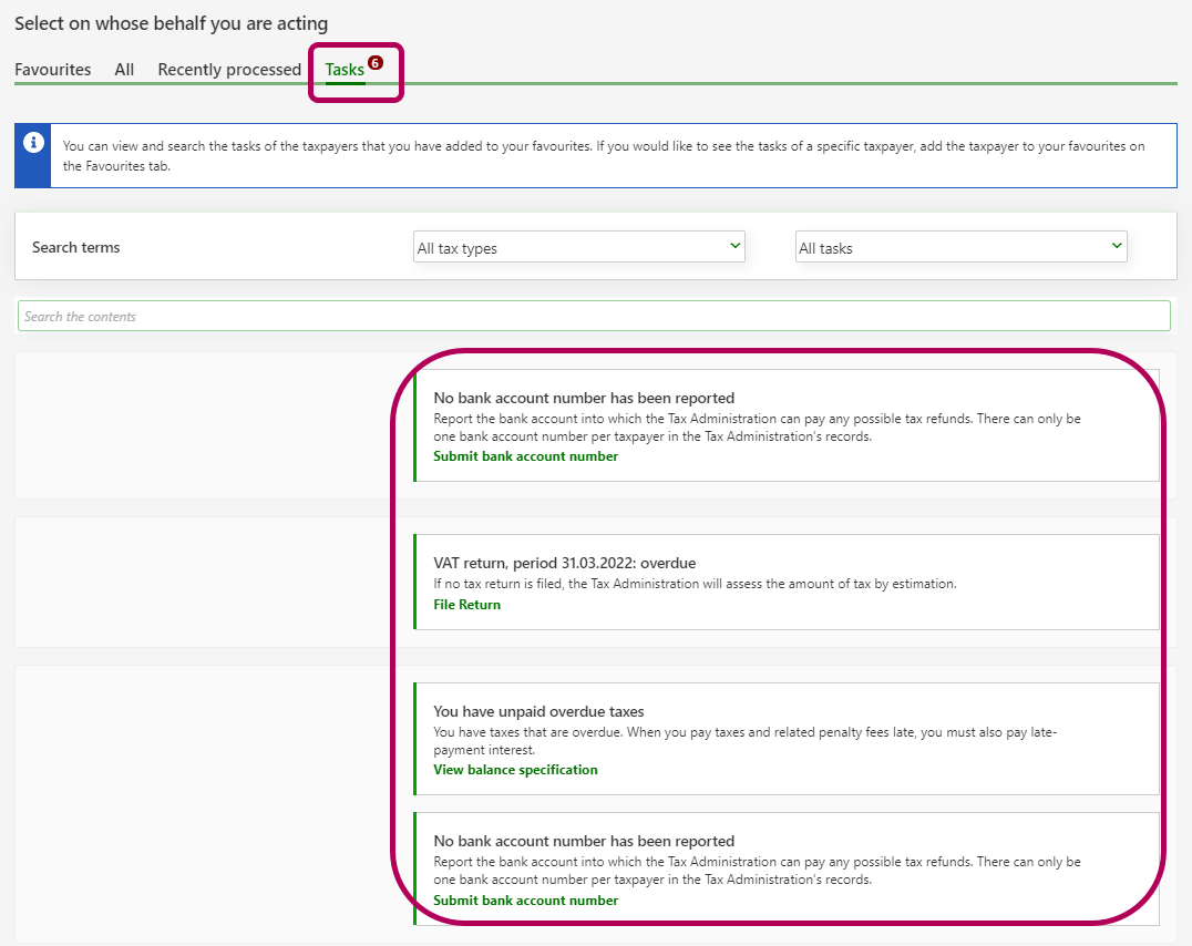 When Your tax types tab has 5 or more different tax types, the Favourites tab will also appear. If you want to add tax types to your favourites, go to the Favourites tab.