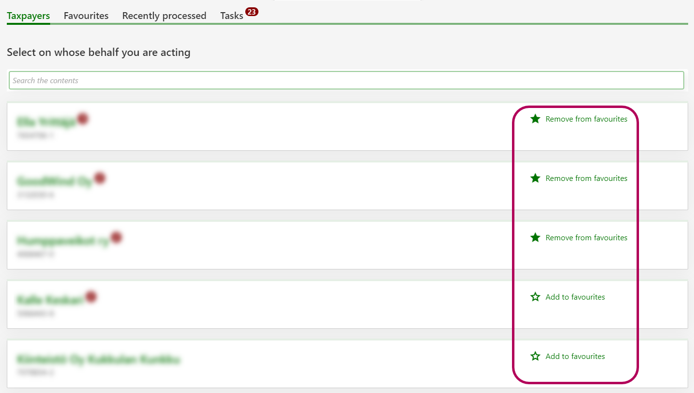 If you have more than 300 customers: You can add favourites on the Taxpayers tab by clicking Open the complete list of taxpayers.