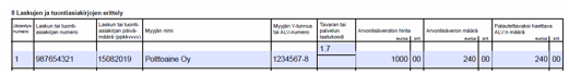 Example: Your company sells both consultancy services subject to VAT and healthcare services exempt from VAT. Your company’s employee has made a business trip to Finland. During the business trip, they participated in meetings relating to taxable operations (consultancy services) and other meetings relating to VAT-exempt operations (healthcare). The travel expenses (e.g. hotel and taxi costs) must be divided between the taxable and tax-exempt operations. Do this for each invoice.