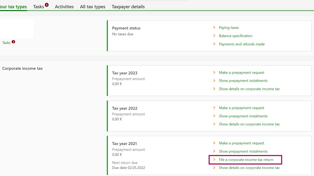 Corporations can pay corporate income tax using the web invoice. A corporate entity whose web invoice address is found in MyTax receives web invoices about prepayments and back taxes, but not about additional prepayments. The web invoice is sent approximately 3 weeks before the due date. Read more about the web invoice.