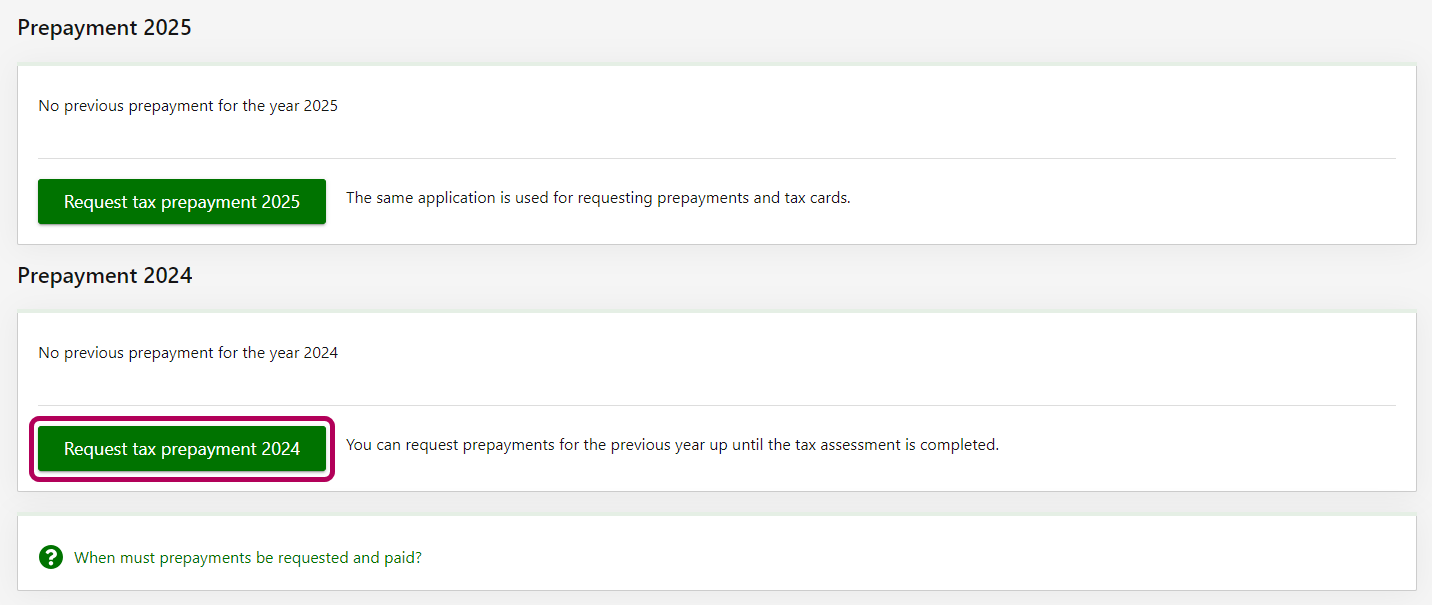 - If you cannot estimate the exact additional prepayment, enter your actual amounts of income and deductions for the entire year. Click Report corrected income and deductions in the request. Complete the tax-card and prepayment request following these instructions, and MyTax will calculate the amount required: How to request prepayments — individual taxpayers
