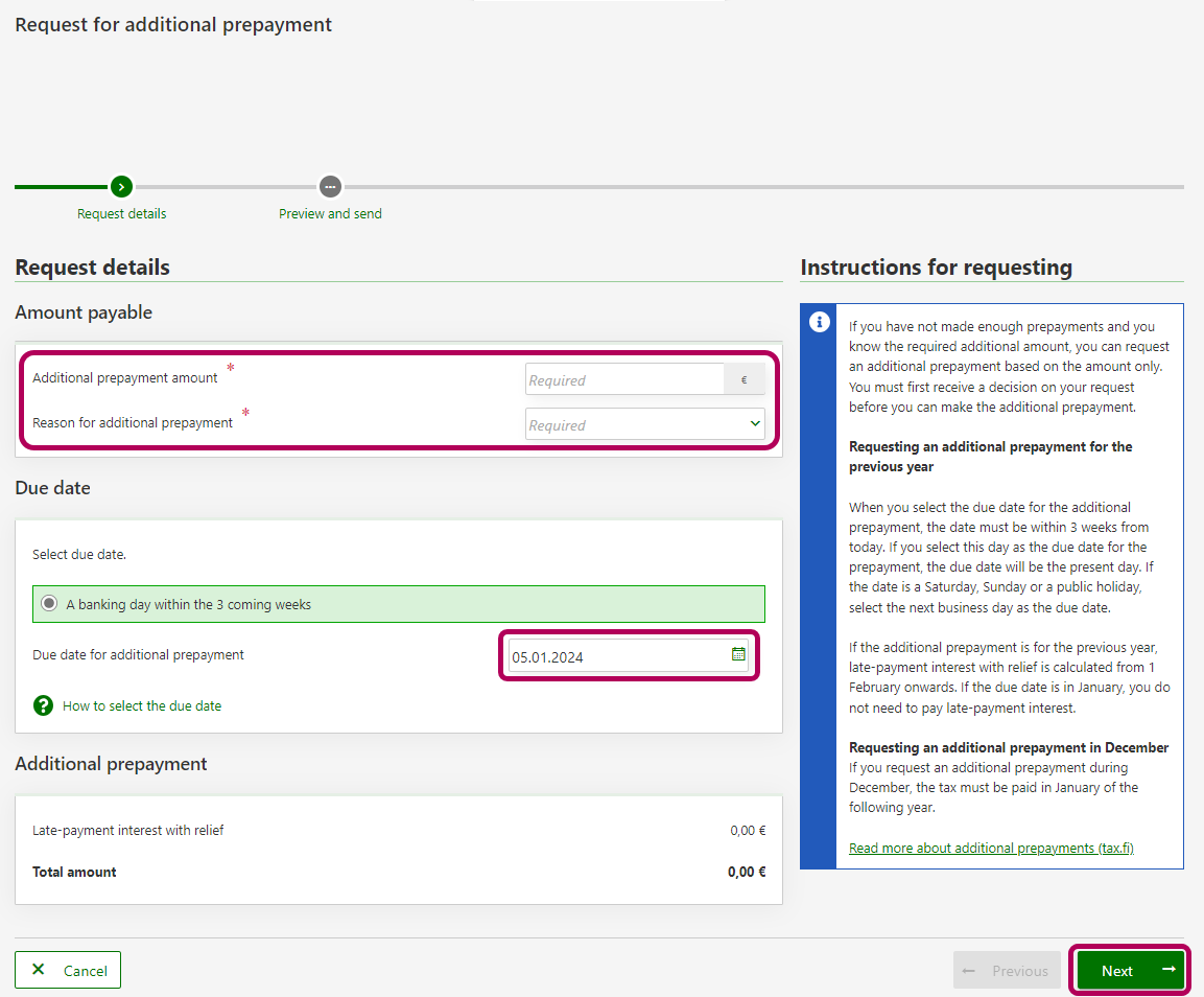 Enter the amount of additional prepayment and select your reason for submitting the request. Typical reasons are “received rental income” and “sales profits and capital gains”.
