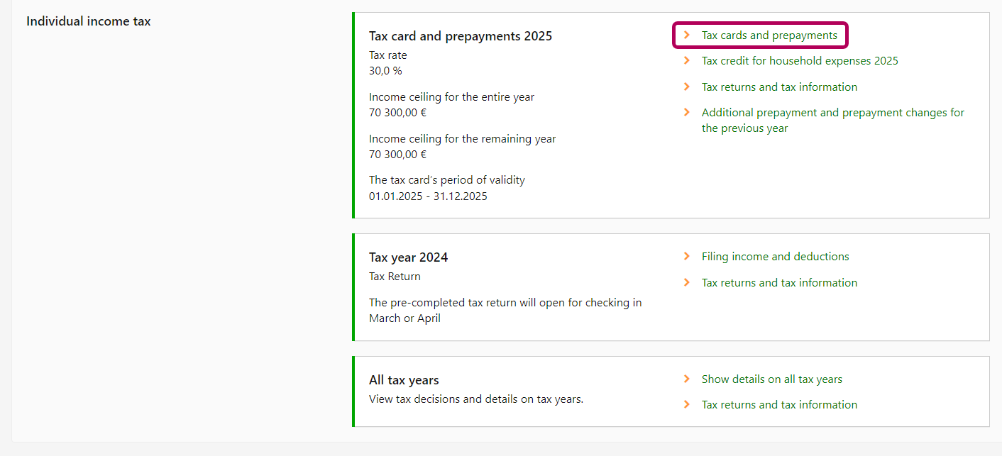 Go to the Individual income tax section, select Tax card and prepayments 2026 and click Tax cards and prepayments.