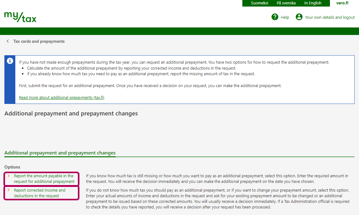 - If you cannot estimate the exact additional prepayment, enter your actual amounts of income and deductions for the entire year. Click Report corrected income and deductions in the request. Complete the tax-card and prepayment request following these instructions, and MyTax will calculate the amount required: How to request prepayments — individual taxpayers