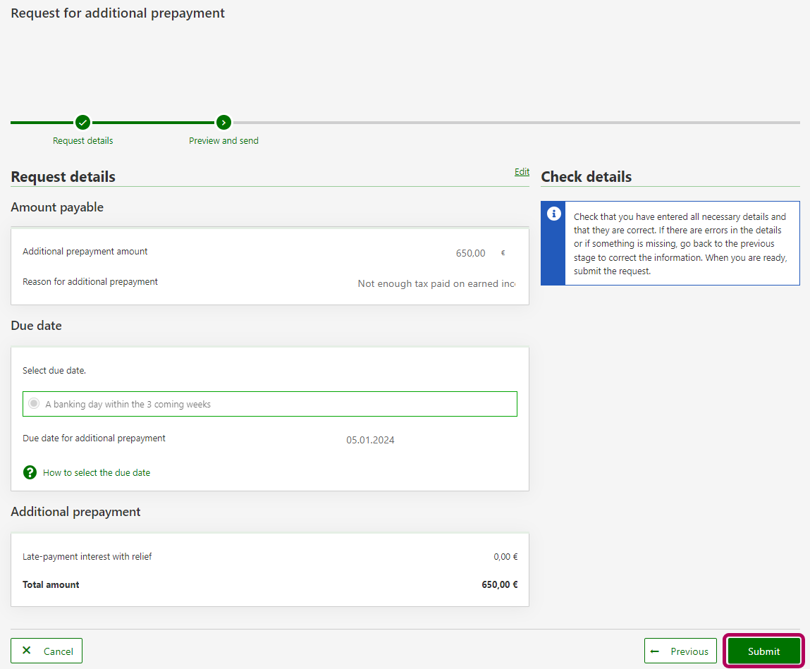 Enter the amount of additional prepayment and select your reason for submitting the request. Typical reasons are “received rental income” and “sales profits and capital gains”.