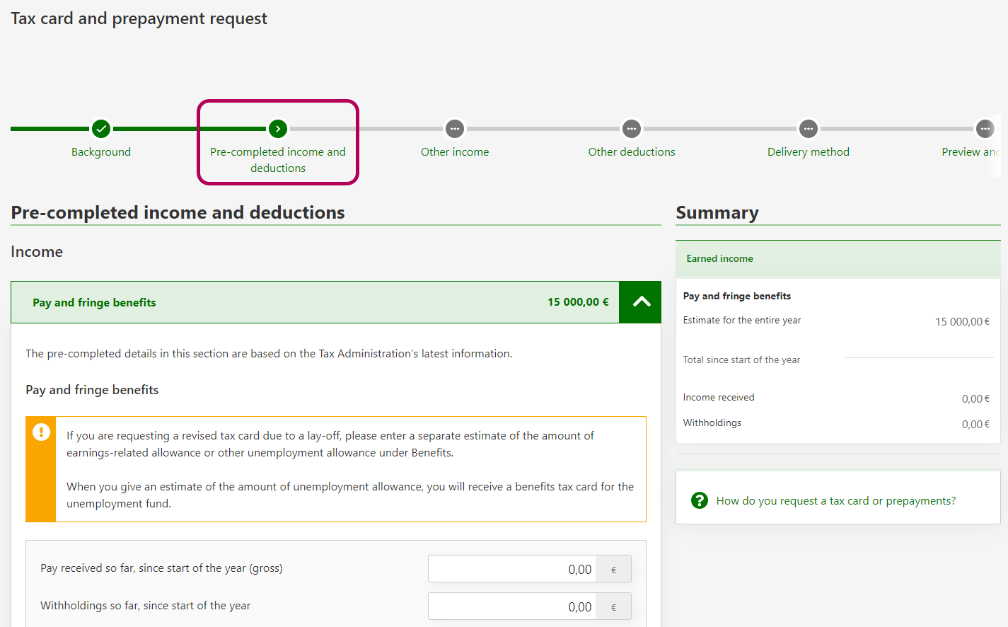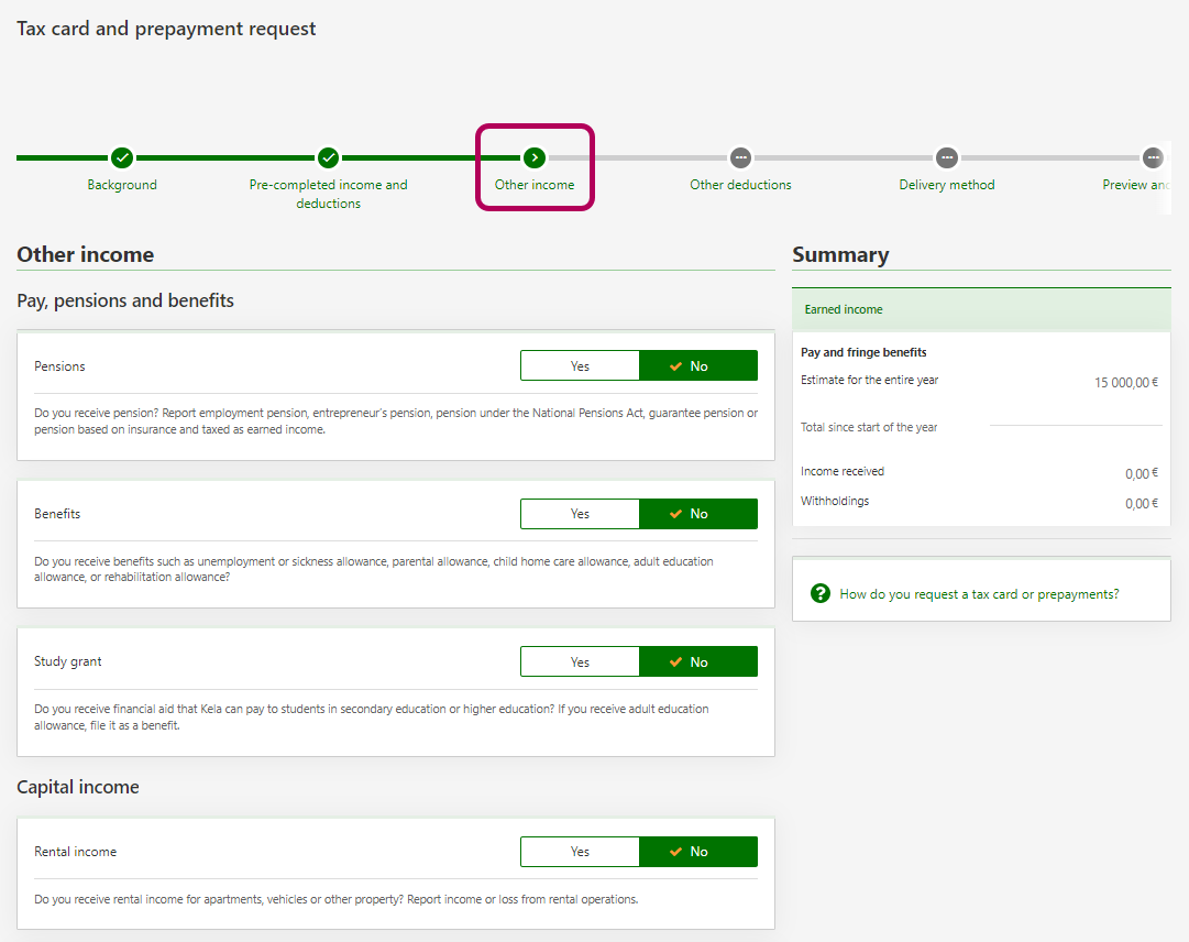 Note: If you work from home for a foreign employer, and you are paid a salary that you need a prepayment decision for, please go directly to Other income (do not make any salary changes here).