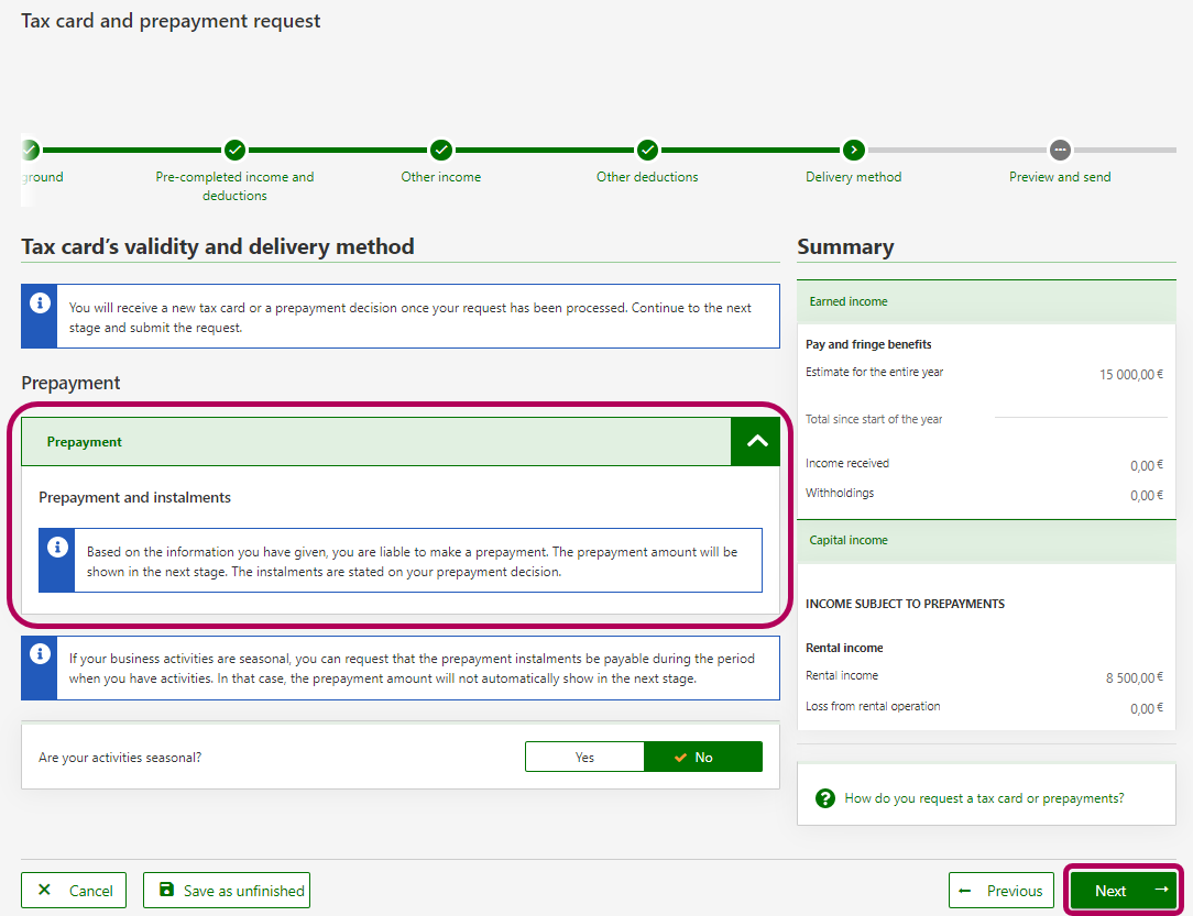 If you have activated Suomi.fi messages, you will receive a message once your prepayment decision is available in MyTax. If you have not activated Suomi.fi messages, you will receive the decision by post.