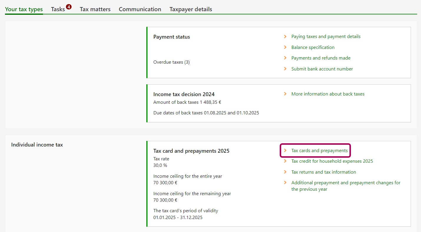 Click the link Tax cards and prepayments in the Tax card and prepayments 2025 section under Individual income tax.