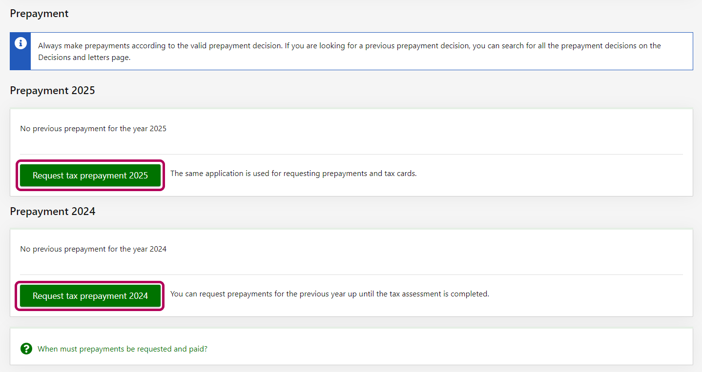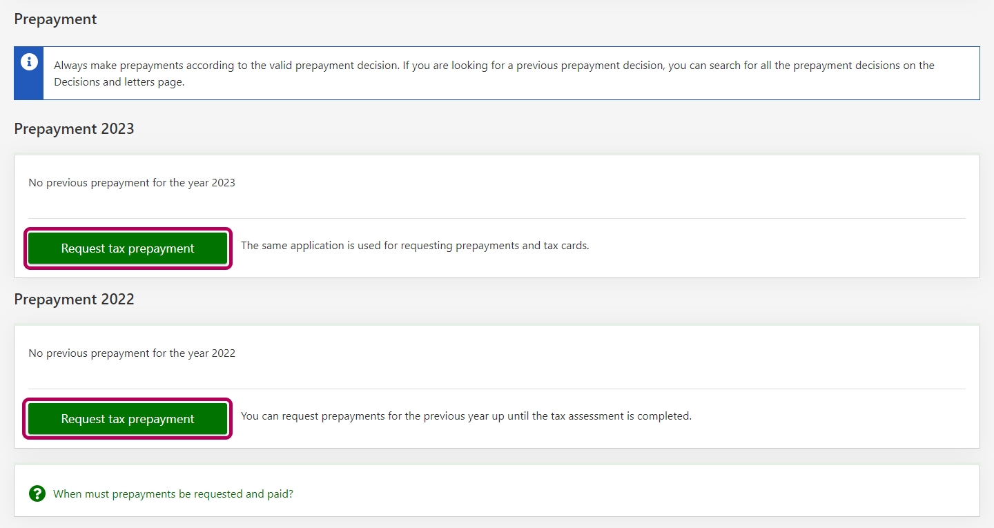 Click either the Request tax prepayment or Change the prepayment button, depending on whether the Tax Administration has already prepared a prepayment calculation for you for the year concerned.
