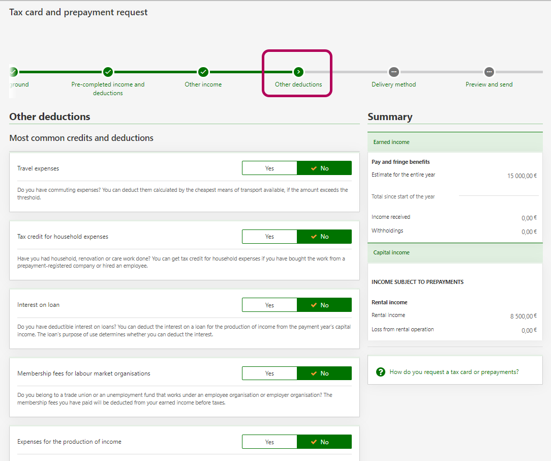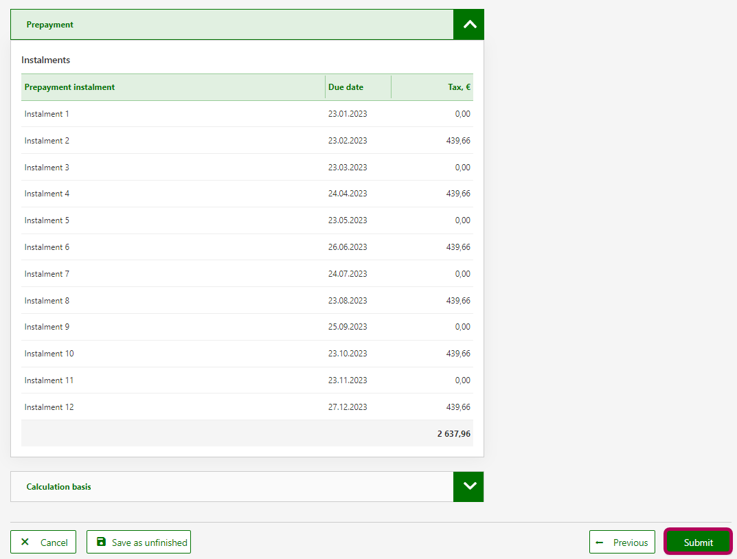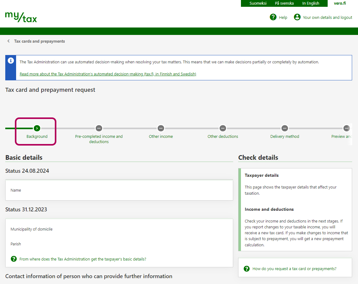 If you have activated Suomi.fi messages, you will receive a message once your prepayment decision is available in MyTax. If you have not activated Suomi.fi messages, you will receive the decision by post.