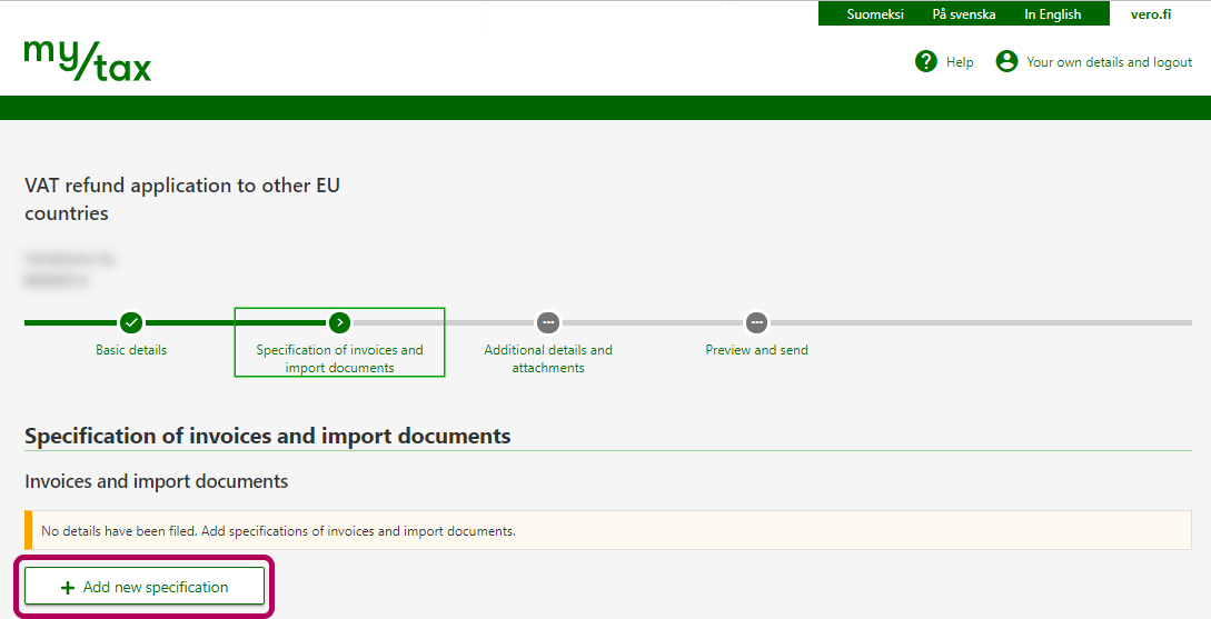 You can add new invoices and import documents by clicking Add new specification. When you have added all the specifications, go to Additional details and attachments.