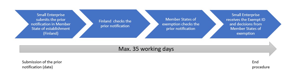 A Finnish company uses a prior notification to declare that it intends to apply the VAT exemption for small businesses in Estonia and Sweden. Estonia is the first to grant a tax exemption, and it informs the Finnish authorities of the decision. The company may now start applying the VAT exemption in Estonia as soon as it receives an Exempt ID from the Finnish authorities.