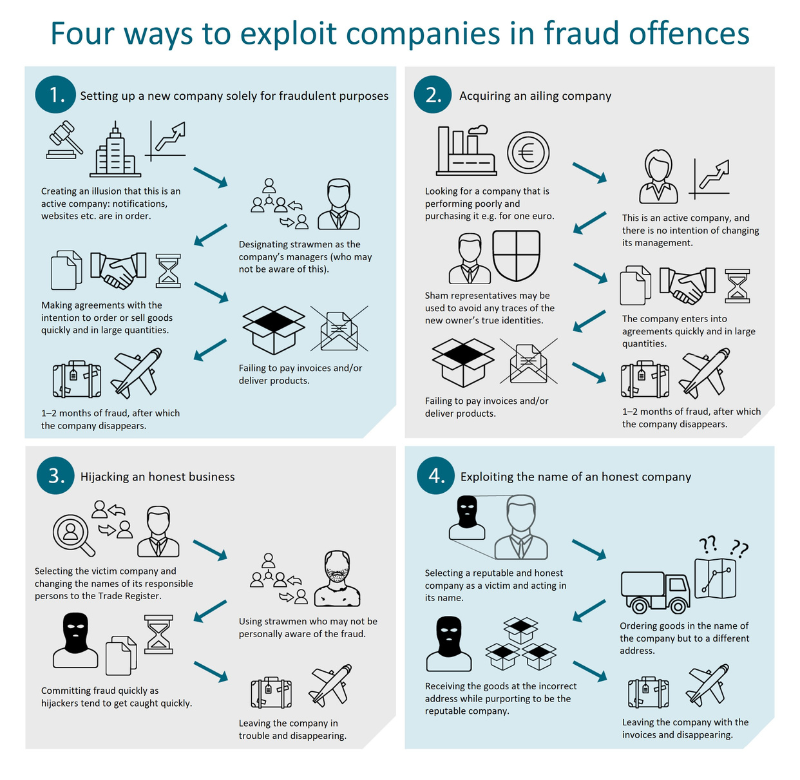 The same companies often carry out many kinds of fraud involving orders and VAT returns, for instance, and may also apply for groundless refunds of employer contributions. The public authorities have also been informed of the use of the Incomes Register in benefit and loan fraud and money laundering. Cases of corporate identity theft have also been detected – that is, fraudsters have misused the business ID and status of an honest company to commit such offences. One well-established form of professional exploitation of companies involves the acquisition of a company with the intent of covering up or committing a fraud. In such cases, companies that have tax debt or are otherwise in trouble are sold with a view to winding down their operations. The fraudsters may use such companies to keep sales income off the books and as tools for committing various kinds of fraud.