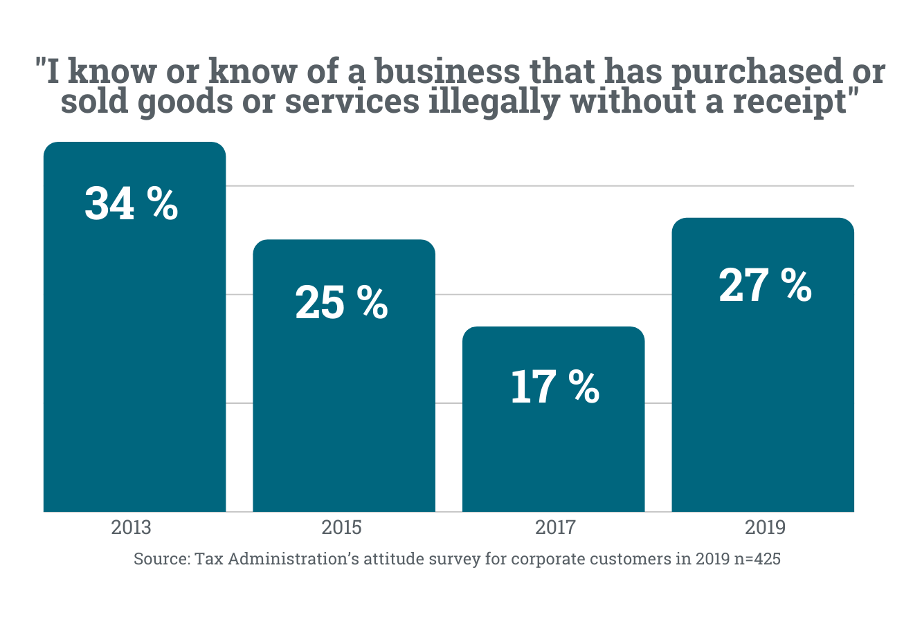 In 2019, 27 per cent of the survey respondents said they knew or knew of a business that had purchased or sold goods or services illegally without a receipt. The results show a significant turn for the worst, as the corresponding figure in 2017 was 17 per cent.