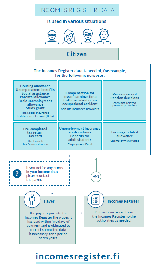 If there is an error in the data, it may affect various decisions that are made based on Incomes Register data. For example, pre-completed tax returns, daily allowance for lay-off or unemployment, and various benefits paid by Kela are all based on Incomes Register data.