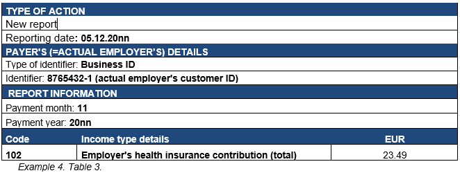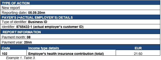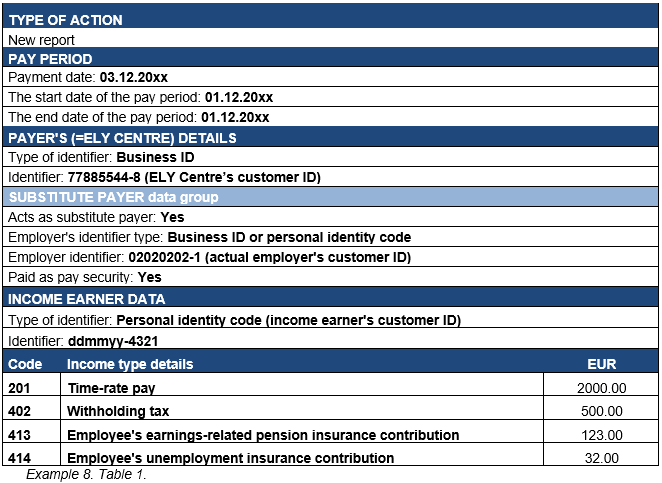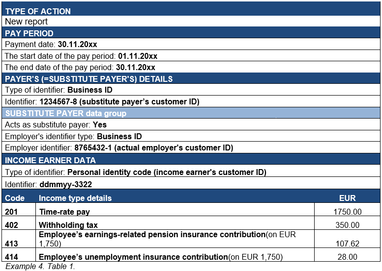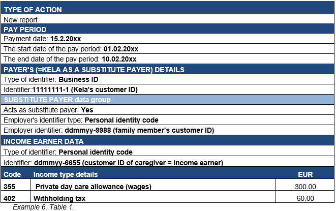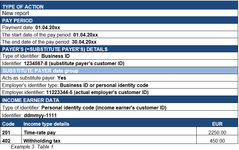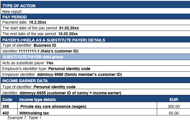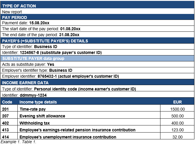 In addition, examples are provided to describe the reporting of the most common situations involving a substitute payer: reporting of payments made by Kela, a bankruptcy estate, municipalities and pay security.