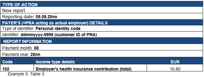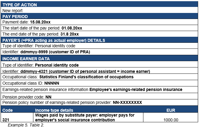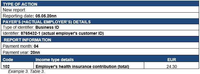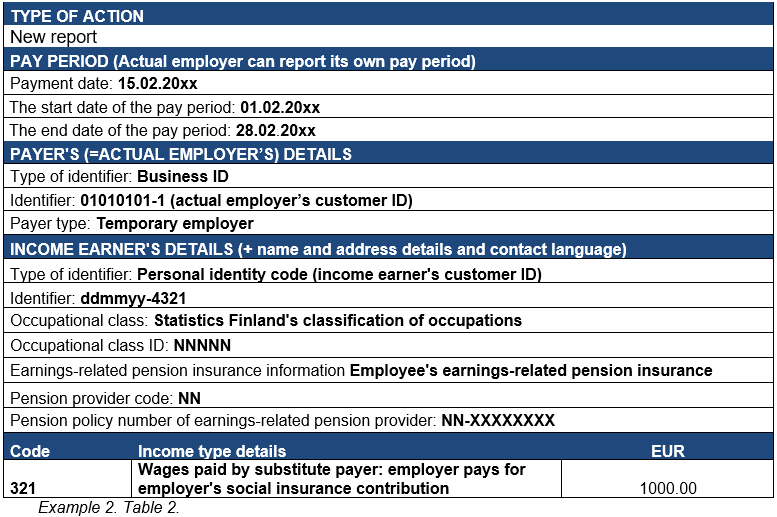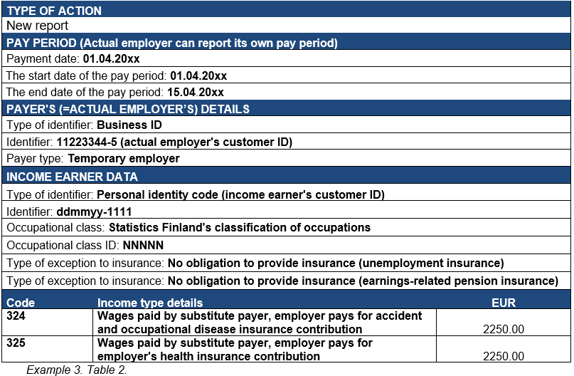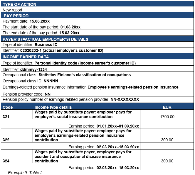 The actual employer must submit an earnings payment report to the Incomes Register using income types specified for situations involving a substitute payer (see the list below). If the wages paid to the income earner are subject to all social insurance contributions, the actual employer reports the wages under the income type: ”Wages paid by substitute payer: employer pays for the employer's social insurance contribution (earnings-related pension, health, unemployment, and occupational accident and disease insurance contributions)”. If the wages are subject only to a certain employer's contribution, the income is reported under the income type for that particular contribution. For example, if the income were subject only to the employer's health insurance contribution, it would be reported under the income type “Wages paid by substitute payer, employer pays for employer's health insurance contribution”. More than one income type intended for situations involving a substitute payer can be used for the same payment (see chapter 2.4, example 9, table 2).