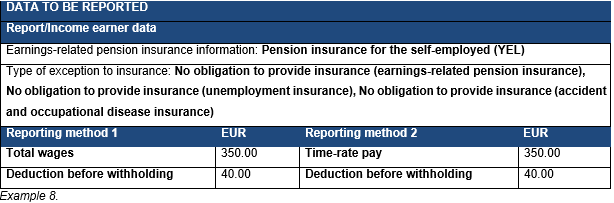 The examples in these instructions describe reporting data both as a total amount and in an itemised manner. The examples do not present all data whose submission is mandatory, only the data necessary to reporting the special circumstances described in these instructions. The reporting of withholding, for example, is not separately described. The monetary amounts used in the example are illustrative in nature, and the amount of social insurance contributions, the withholding rate and tax-exempt reimbursement of expenses must be checked annually. The withholding is determined based on the earner-specific withholding rate.