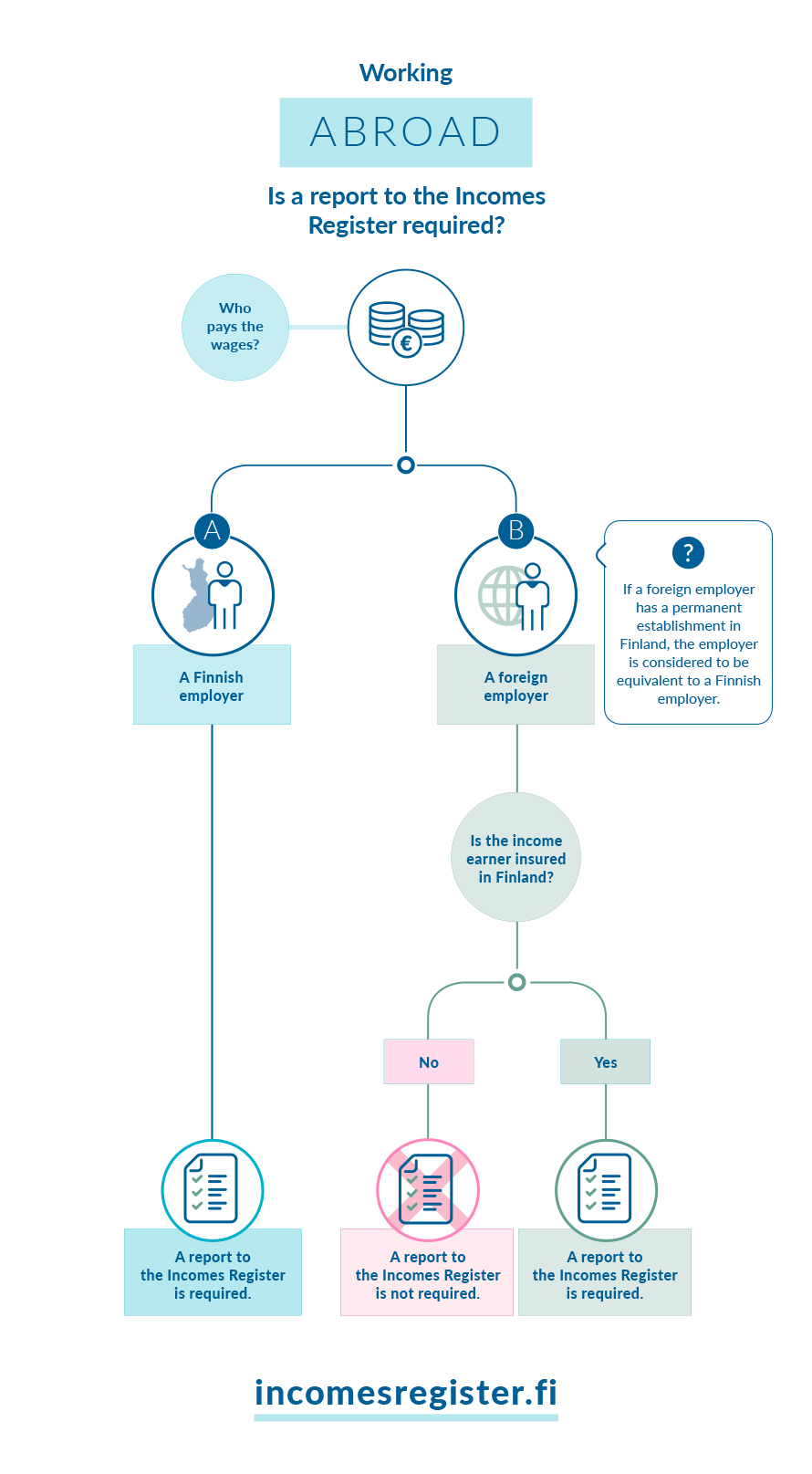 The income paid to an income earner for work performed abroad and other information must be reported to the Incomes Register on an earnings payment report when the information is required for taxation purposes or when the income earner is insured in Finland. Correspondingly, the income paid for working in Finland to an employee who came to Finland from abroad is reported using an earnings payment report.