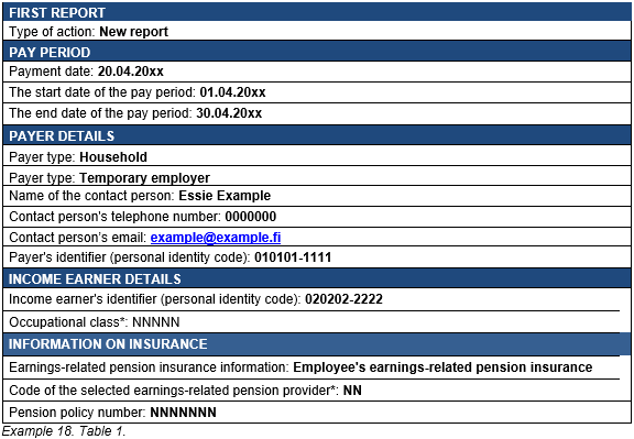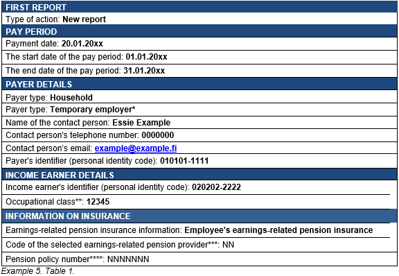 When the employer is a household, the work is reported using the payer’s name and personal identity code. The wage or non-wage compensation for work paid by a household must be kept apart from the same person’s agricultural or business activities. Work related to agricultural or business activities is reported using a business ID. Work for a household employer is not reported as business activities using a business ID.