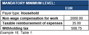 Example 16: A household pays a non-wage compensation for work of EUR 2,000 and a taxable reimbursement of expenses for tools of EUR 35 to an entrepreneur with a business name who is not registered in the prepayment register. Tax is withheld from the amount of EUR 2,035. According to the entrepreneur’s tax card, the withholding rate is 25%. In addition to the payer’s and recipient’s identifying information, the following data is reported: