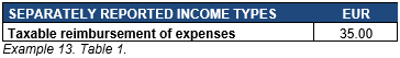 Example 13: A construction worker is paid a tool allowance of EUR 35 based on a collective agreement. No tax is withheld or social insurance contributions are paid from such a reimbursement. The monetary amount of the allowance is reported using the income type Taxable reimbursement of expenses.