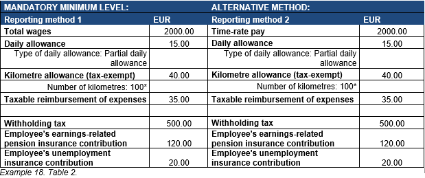 Example 18: A household is a temporary employer and is not registered in the Tax Administration’s Employer Register. The household pays a lump sum of EUR 2,000 for a renovation, a reimbursement of EUR 35 for work equipment, a tax-exempt kilometre allowance of EUR 40 for 100 km for picking up materials, and a partial daily allowance of EUR 15. The work was performed in April and the wages were paid on 20 April. The household had not paid any other wages earlier in the year.