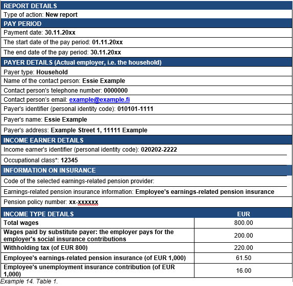 Example 14: The household is a contract employer and has agreed that the nanny’s wages are EUR 1,000 per month from the beginning of the year. Of this sum, EUR 200 is private day care allowance paid by Kela. The wages paid by the household amount to EUR 800. The household submits the following report for November: