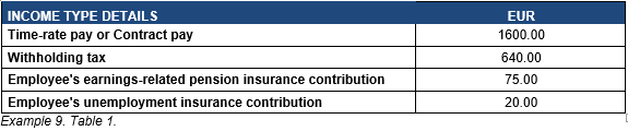 The amounts used in the examples are merely illustrative. You must check the amount of the social insurance contributions annually from the websites of pension insurance companies or the Tax Administration, for example. Tax is withheld according to each income earner's withholding rate.