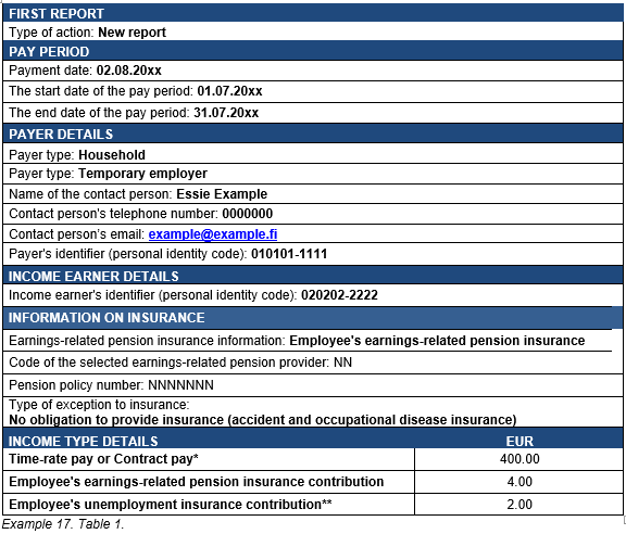 Example 17: A household is a temporary employer and is not registered in the Tax Administration’s Employer Register. The household pays EUR 400 in wages as a lump sum to a 15-year-old neighbour for caring for school-aged children. The family is not entitled to private day care allowance. The work was performed in July and the wages were paid on 2 August. No taxes are withheld in this example and no other payments are made during the year.