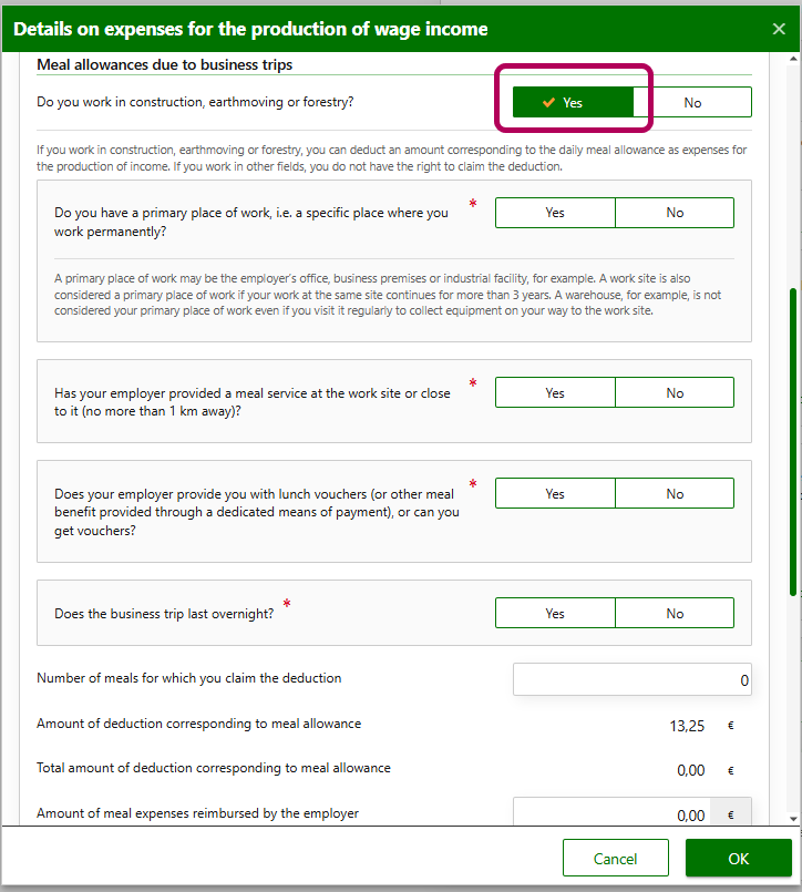 Scroll down until you reach Meal allowance due to business trips and, to answer the question about your work in construction, earthmoving or forestry, select Yes. These are the only lines of work where this deduction is available.