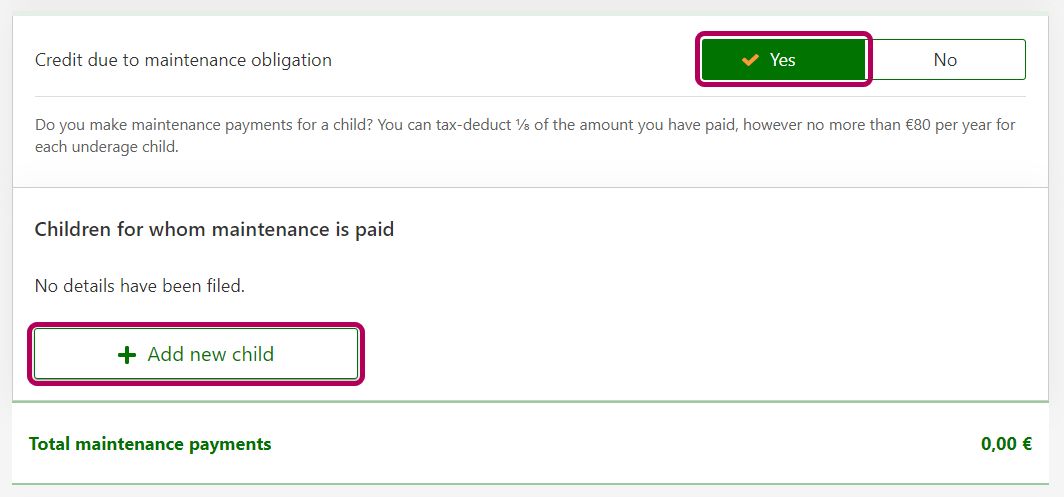 If you have filed a credit due to maintenance obligation previously for your tax card or prepayments, you can see it in the Pre-completed income and deductions stage. Correct details, if necessary, in this stage.