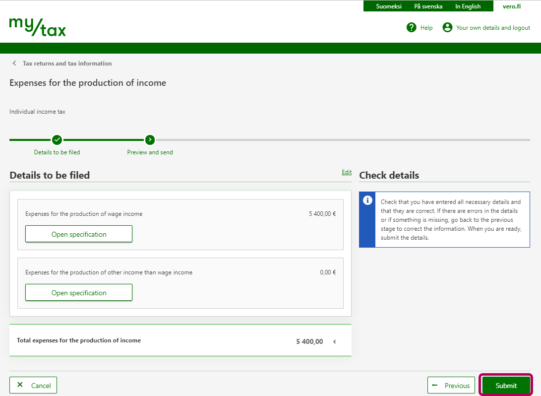 If you have filed expenses for the production of income previously for your tax card or prepayments, you can see them in the Pre-completed income and deductions stage. Correct details, if necessary, in this stage.
