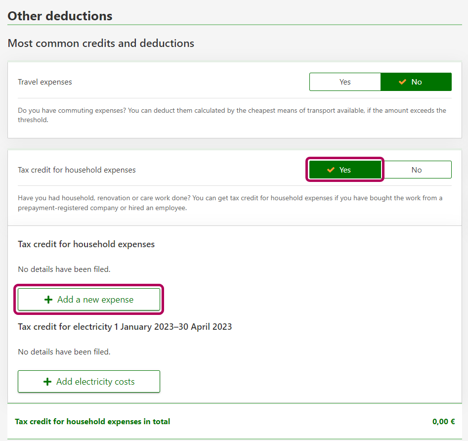 Otherwise move on to Other deductions. First select Yes under Tax credit for household expenses, and then click Add a new expense.