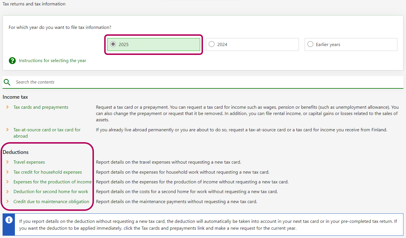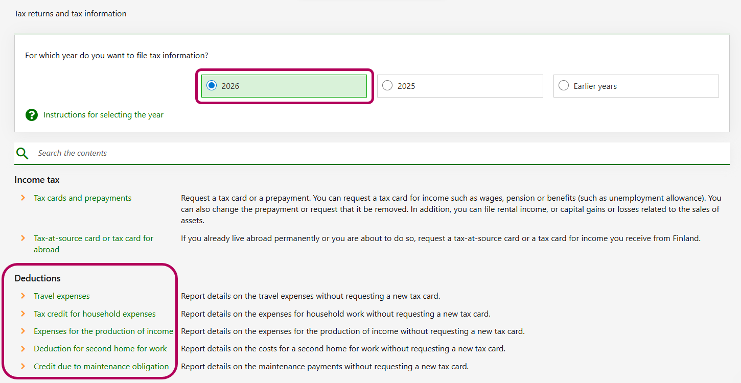You can file travel expenses, a credit for household expenses, expenses for the production of income, a deduction for second home for work or a credit due to maintenance obligation for your tax card or for your pre-completed tax return in MyTax.