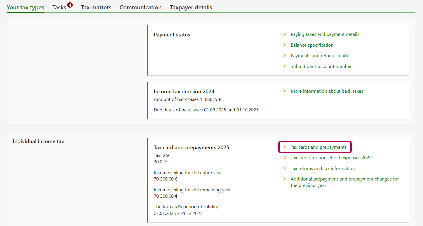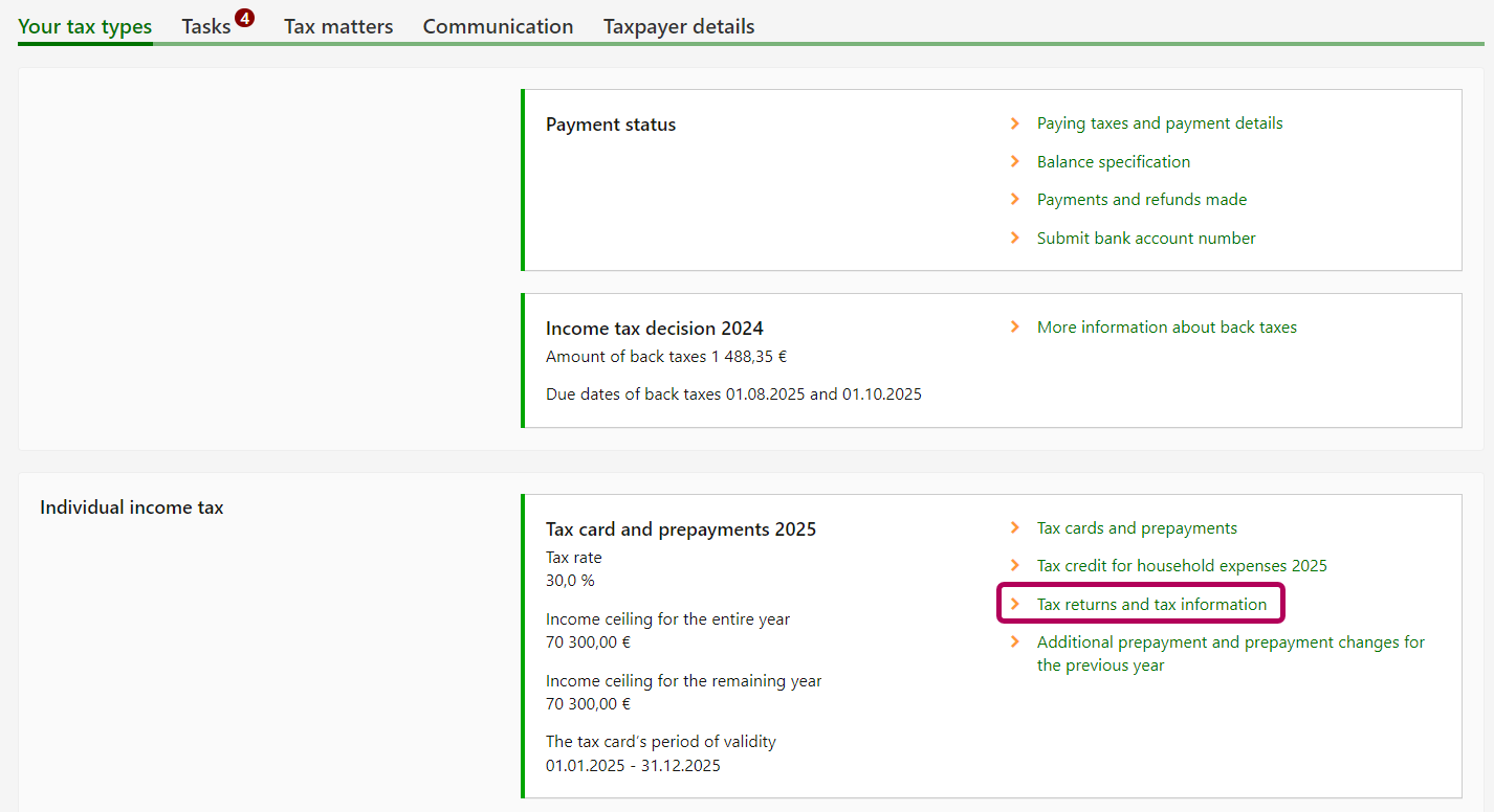 Go to the Individual income tax section, select Tax card and prepayment 2025 and click the Tax returns and tax information link.