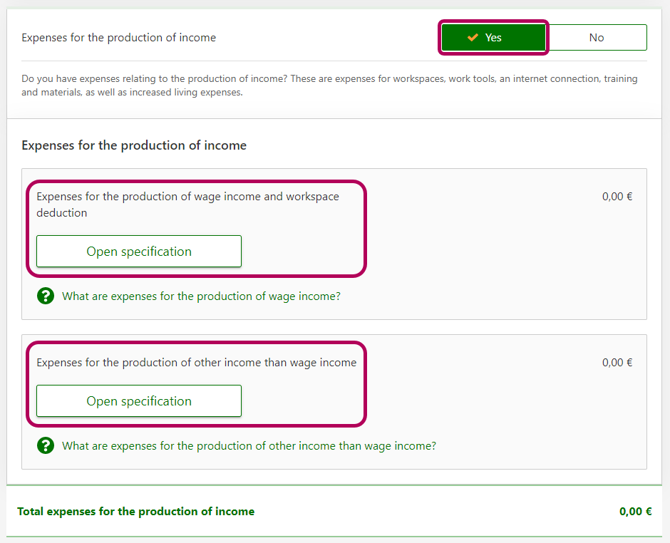 Please note that only the expenses for the production of wage income are automatically included in your pre-completed tax return. You will have to report the expenses for the production of other income again when you receive the pre-completed tax return.