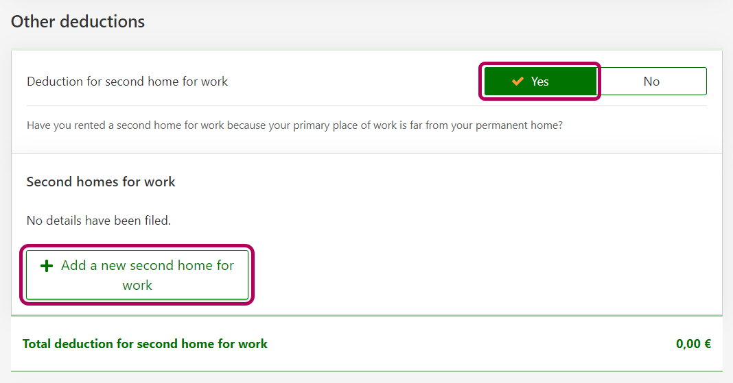 Otherwise move on to Other deductions. First select Yes under Deduction for second home for work, and then click Add new second home for work.