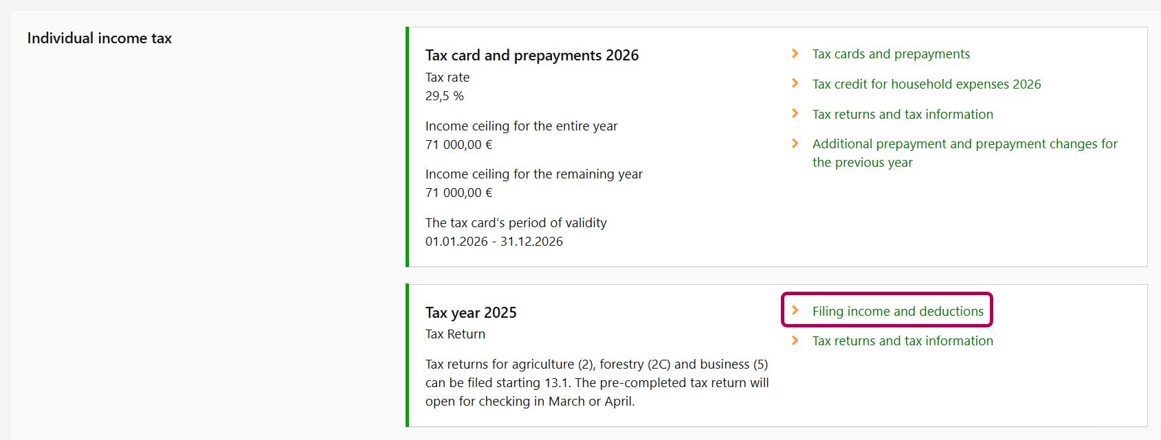 Go to the Individual income tax section, select Tax card and prepayment 2026 and click the Tax returns and tax information link.