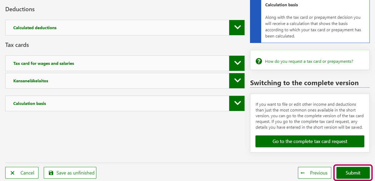 - If you wish to continue filling in the details later, select Save as unfinished. The data entered in the unfinished request will be saved for 1 month. The Tax Administration will not process the data before you have submitted it.